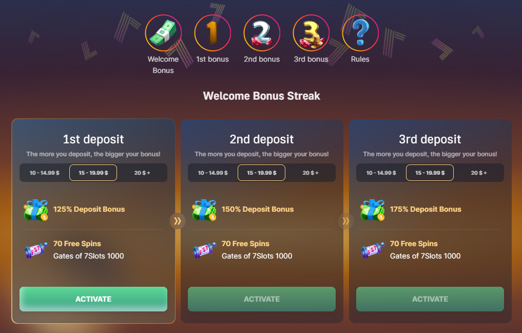7Slots განსაკუთრებულ ყურადღებას უთმობს ბონუსურ პროგრამებს, რომლებიც გათვლილია როგორც ახალ, ისე აქტიურ მოთამაშეებზე.