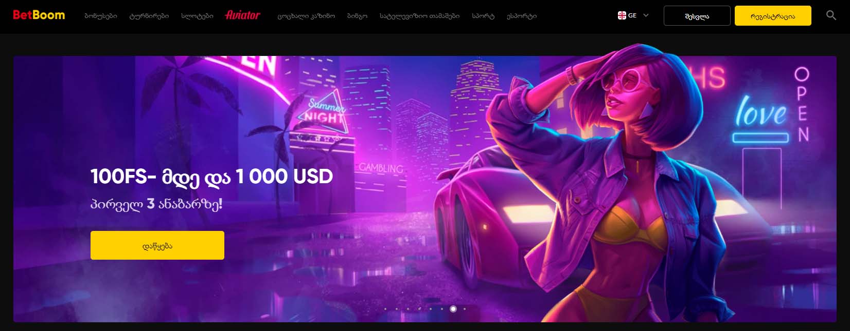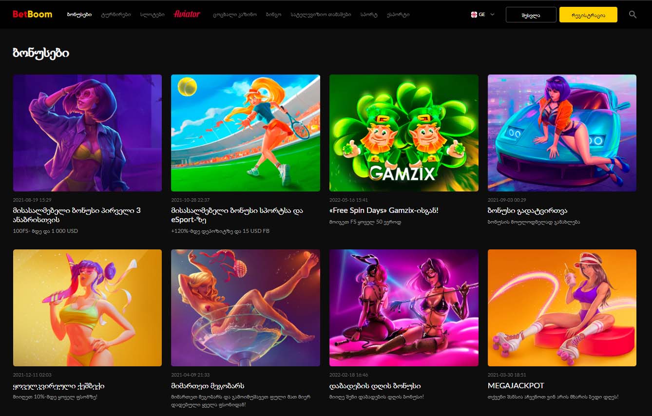 ონლაინ კაზინოების ერთ-ერთი ახალგაზრდა წარმომადგენელი – კომპანია BetBoom-ი სწრაფად და აქტიურად ვითარდება და მუდმივად აუმჯობესებს თავის პროდუქტებს. ყველა გემოვნების და მოთხოვნების მქონე მომხმარებელი დააკმაყოფილებს აქ თავის სურვილებს და იპოვის მისთვის სასურველ კატეგორიას. უამრავი აქციები, ტურნირები, საინტერესო შეთავაზებები და ბონუსები, რომელთა რაოდენობა უპრეცენდენტოთ დიდია – იძლევა მოგების თითქმის 100%-ან შანსს.