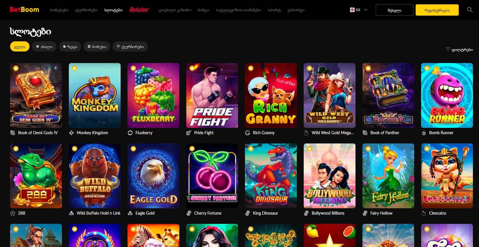 ნავიგაცია კატეგორიებს და მათში განლაგებულ თამაშებს შორის ძალიან მარტივია, რადგან თქვენ შეგიძლიათ გამოიყენოთ ფილტრი და სწრაფად იპოვოთ სასურველი თამაში. იმის მიუხედავად, რომ აქ უამრავი საინტერესო და პოპულარული გართობაა წარმოდგენილი, BetBoom-ის გუნდი მუდმივად ანახლებს თამაშების კოლექციას და ამატებს ონლაინ ინდუსტრიის სიახლეებს.